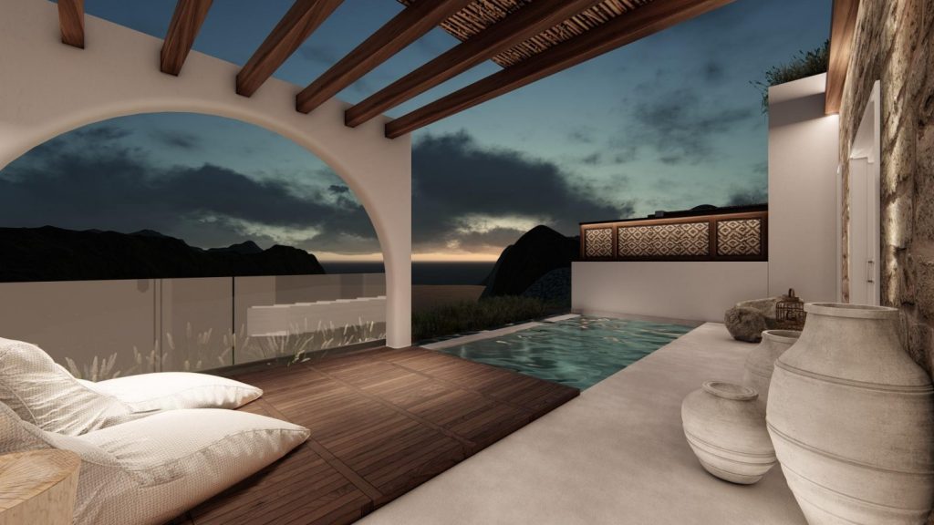 O projeto segue o estilo clássico das Cíclades, com linhas simples e elegantes. Cada residência tem vista panorâmica para o mar e sua própria piscina privativa, criando um refúgio bem íntimo, quase suspenso entre o céu e o mar. Os donos ainda podem usar a piscina comunitária, o spa, o restaurante, jardins bem cuidados e estacionamento privativo — tudo num espaço tranquilo e exclusivo à beira-mar.