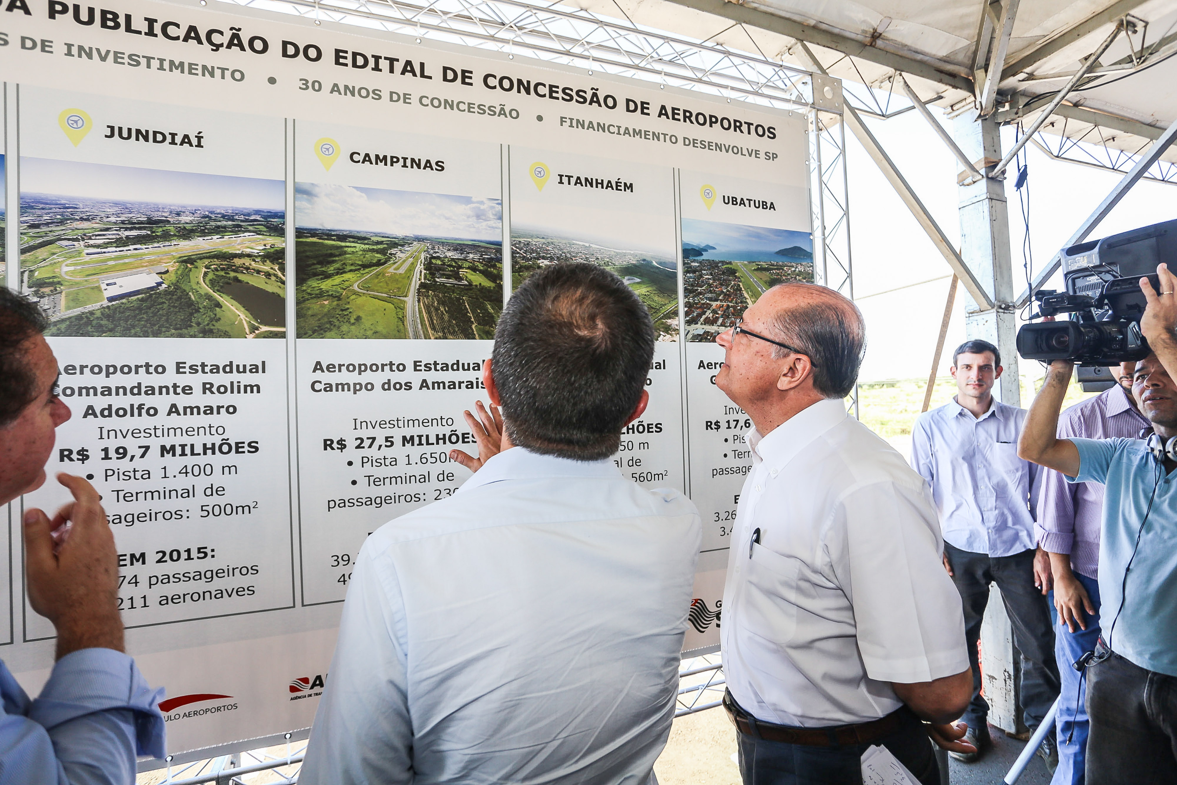 O governador Geraldo Alckmin assinou nesta quarta-feira (20) autorização para que a Artesp (Agência de Transporte do Estado de São Paulo) publique o edital de concessão dos aeroportos Antônio Ribeiro Noronha Jr. (Itanhaém), Gastão Madeira (Ubatuba), Comandante Rolim Adolfo Amaro (Jundiaí), Campo dos Amarais (Campinas) e Arthur Siqueira (Bragança Paulista). As obras previstas para os aeroportos contemplam, por exemplo, melhorias nos sistemas de pistas, pátios e sinalização, como também reformas nos terminais de passageiros e ampliações na infraestrutura de hangares.