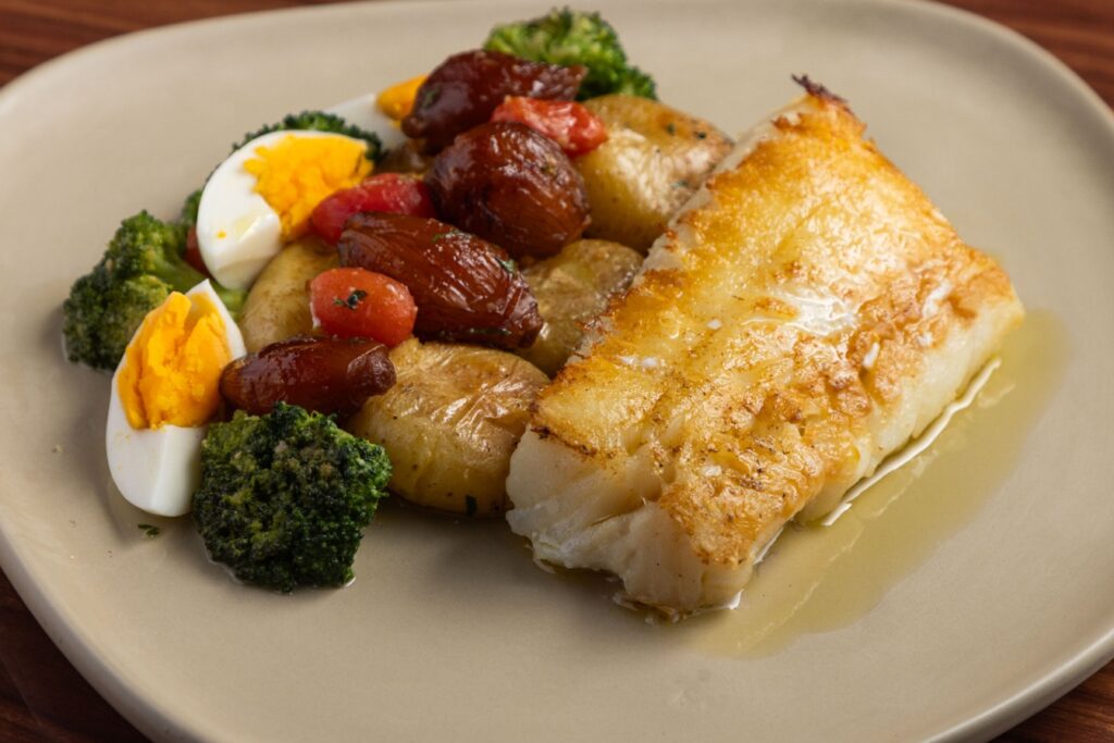 Entre as entradas, opções como Creme de aipim com lascas de bacalhau, Salpicão de tender ou Mix de folhas acompanhado de lula ao forno recheada com farofa de camarão.